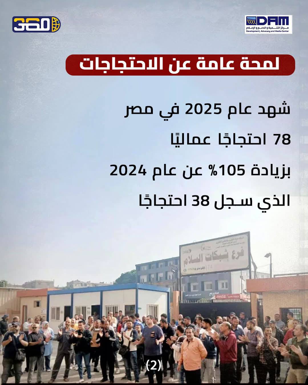 ـ فيما سجلت 6 اعتصامات خلال عام 2025 جاءت من عمال ” الشركة الوطنية للزراعات المحامية ” الصوب” ، الشركة المتحدة للصيادلة ، عمال محطات كهرباء السد العالي ، موظفو شركة لامطات المائية لانتاج الكهرباء بأسوان ، صحفيو واداريو وعمال جريدة الوفد . صحفيو موقع ” البوابة نيوز”